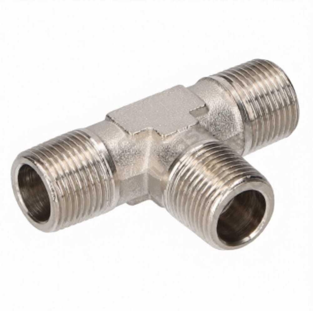 Su diseño en forma de T incorpora tres conexiones con rosca macho de 3/8″, lo que permite unir tres conductos o elementos del sistema hidráulico en un mismo punto. Esta configuración facilita la distribución del flujo dentro de la máquina, simplificando la instalación y el mantenimiento de los diferentes circuitos.
